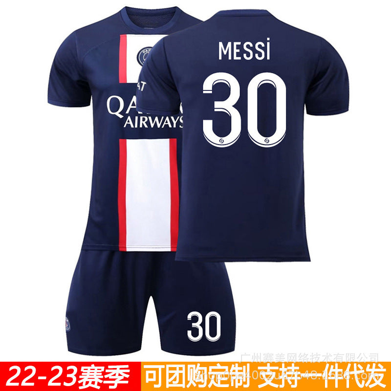 🔴🔵 Fuel your young footballer’s dreams with the 22/23 Paris Saint-Germain Home Jersey Set, featuring the legendary trio — Lionel Messi No.30 🇦🇷, Kylian Mbappé No.7 🇫🇷, and Neymar Jr. No.10 🇧🇷! Now available in Nepal 🇳🇵, this children's jersey suit is ideal for wholesale purchase — perfect for schools, football academies, gift shops, or team gear ⚽🎁.