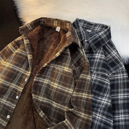 Men’s Retro Plaid Fleece-Lined Shirt – Warm & Casual