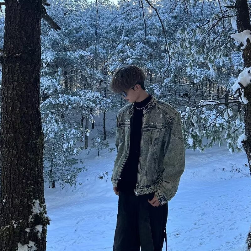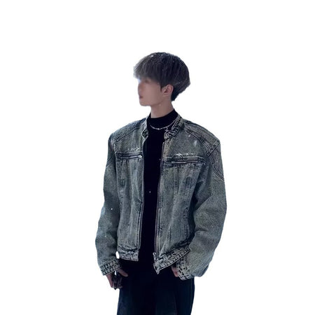 Turn heads with this American style short denim jacket for men 👕. Designed with a structured shoulder pad collar, it offers a high-end feel and hairstylist-approved streetwear look.