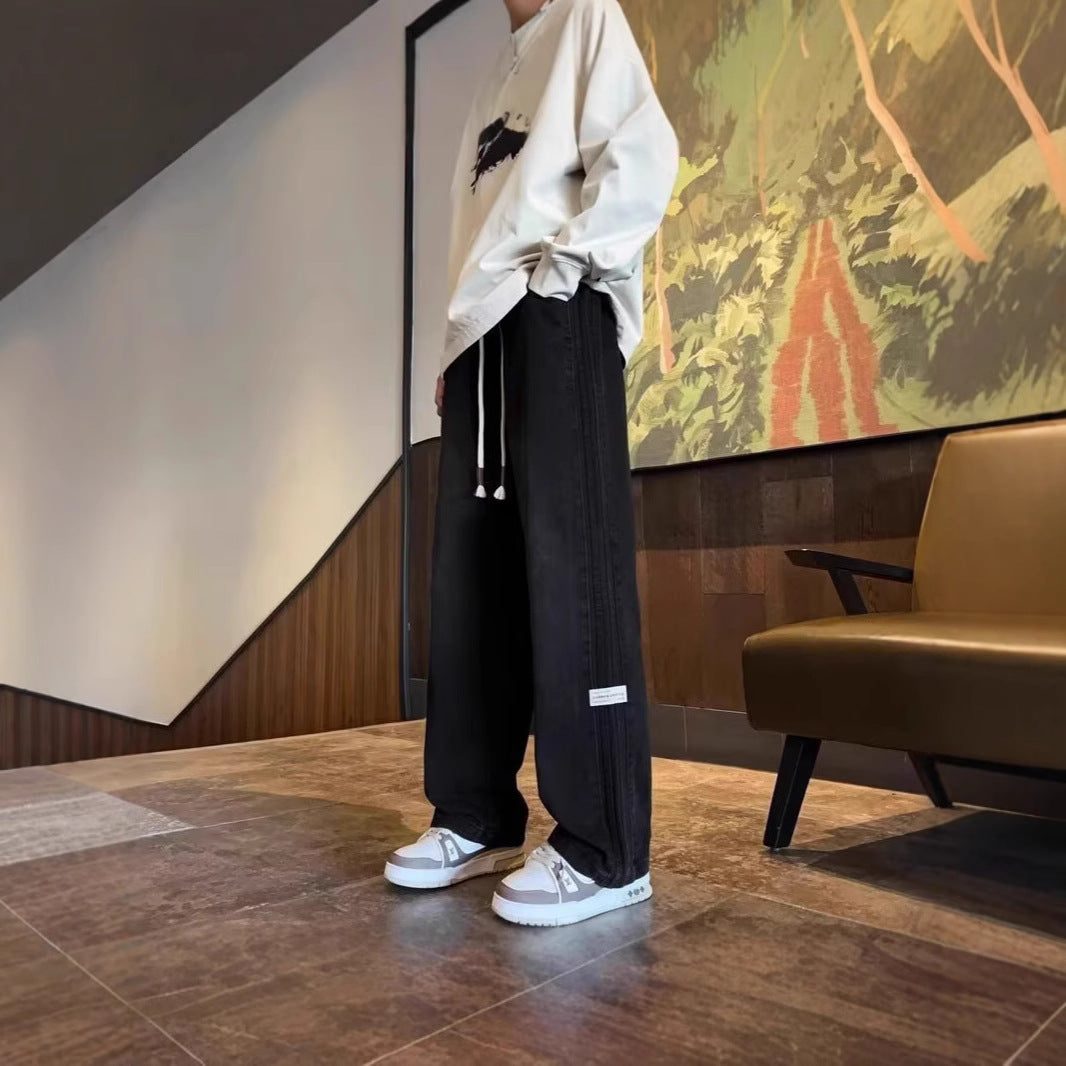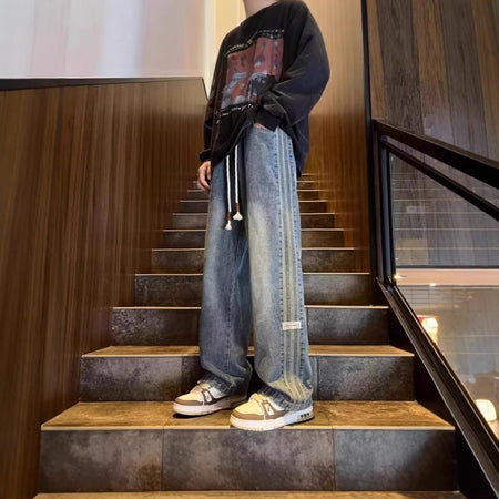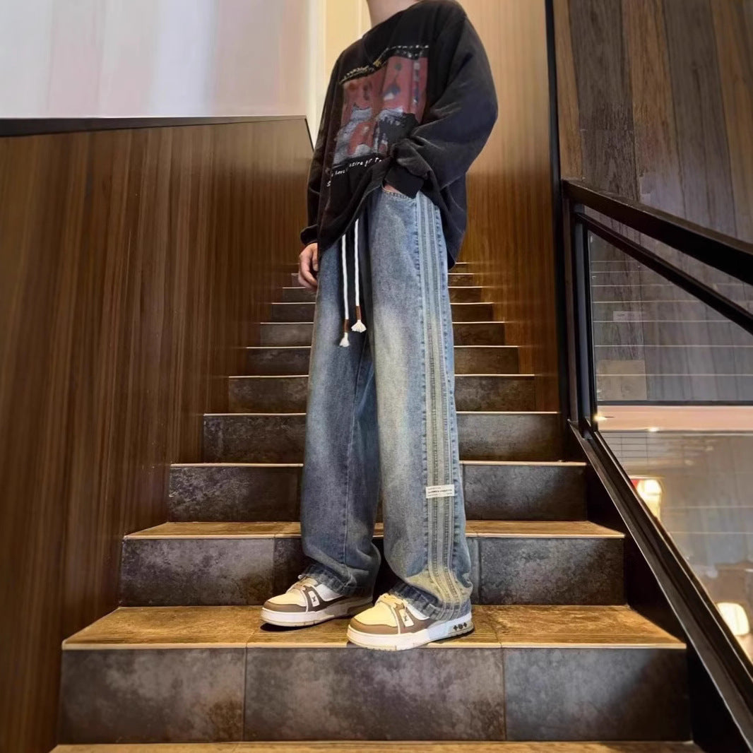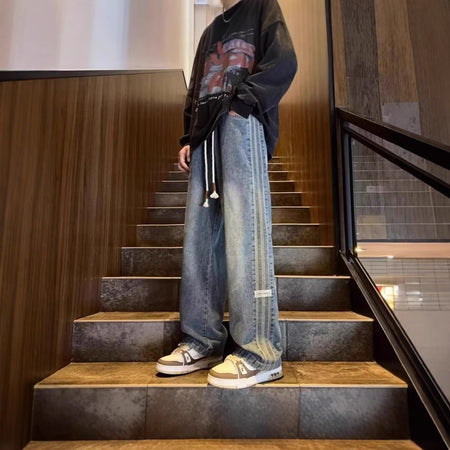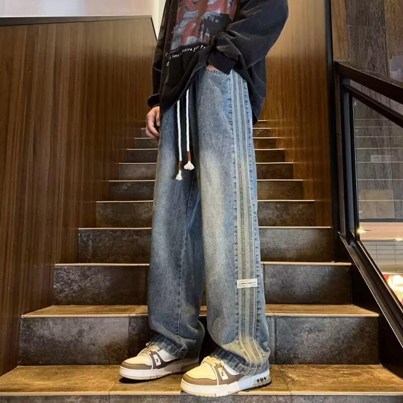 🔥 Stand out from the crowd with these American-Style 3-Bar Wide-Leg Jeans — made for the modern man who owns his look 🏙️💪 Featuring a relaxed straight cut, bold side stripes, and a comfy high-street vibe, these pants are the perfect blend of sporty and stylish.