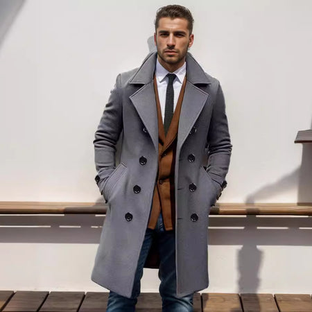 Elevate your autumn and winter wardrobe with this men’s mid-length double-breasted wool coat, crafted for a sleek European style. Its slim-fit design and minimalist silhouette make it the perfect choice for modern men who value elegance and comfort.