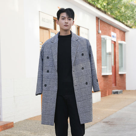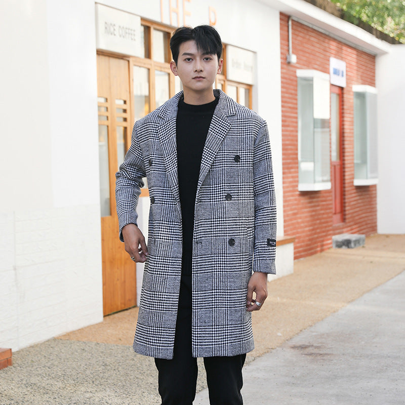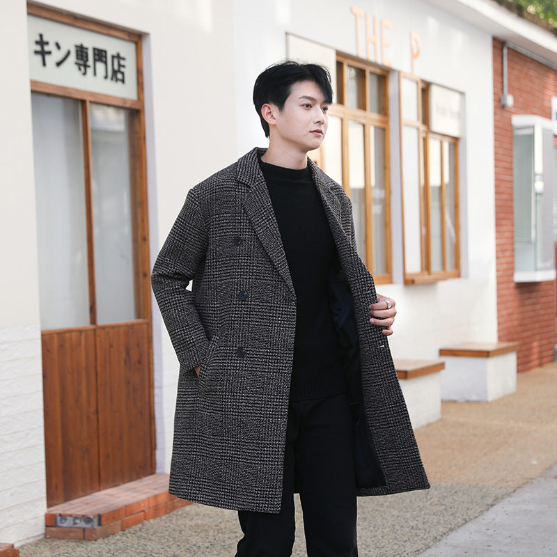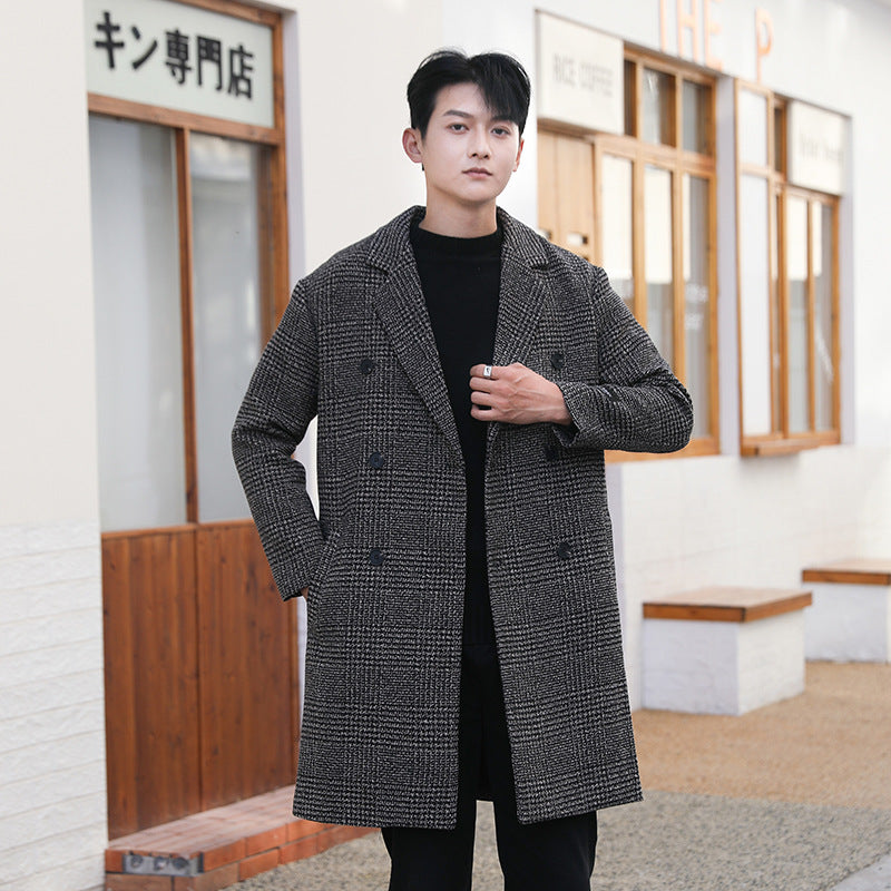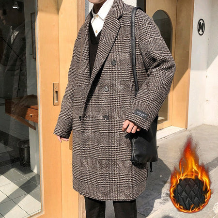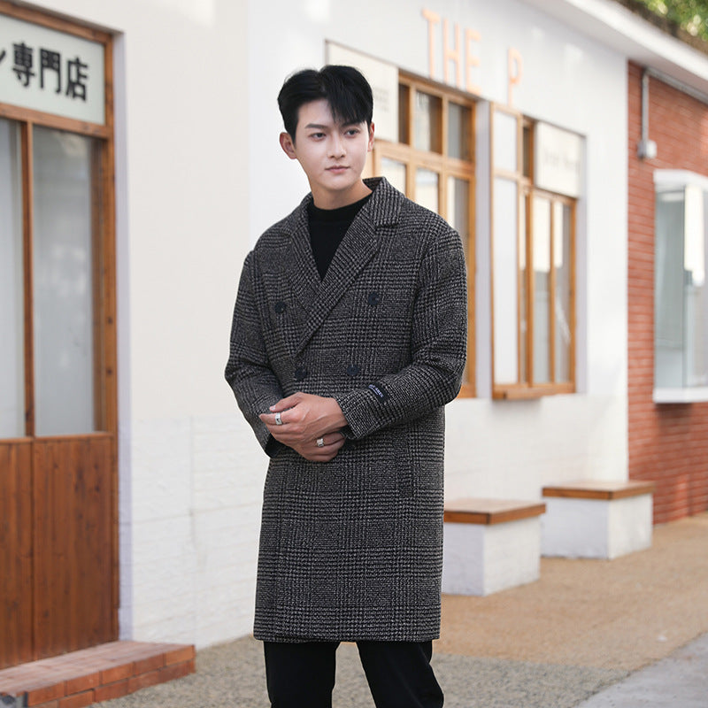 Men’s Woolen Mid-Length Trench Coat Autumn Winter Plaid Loose