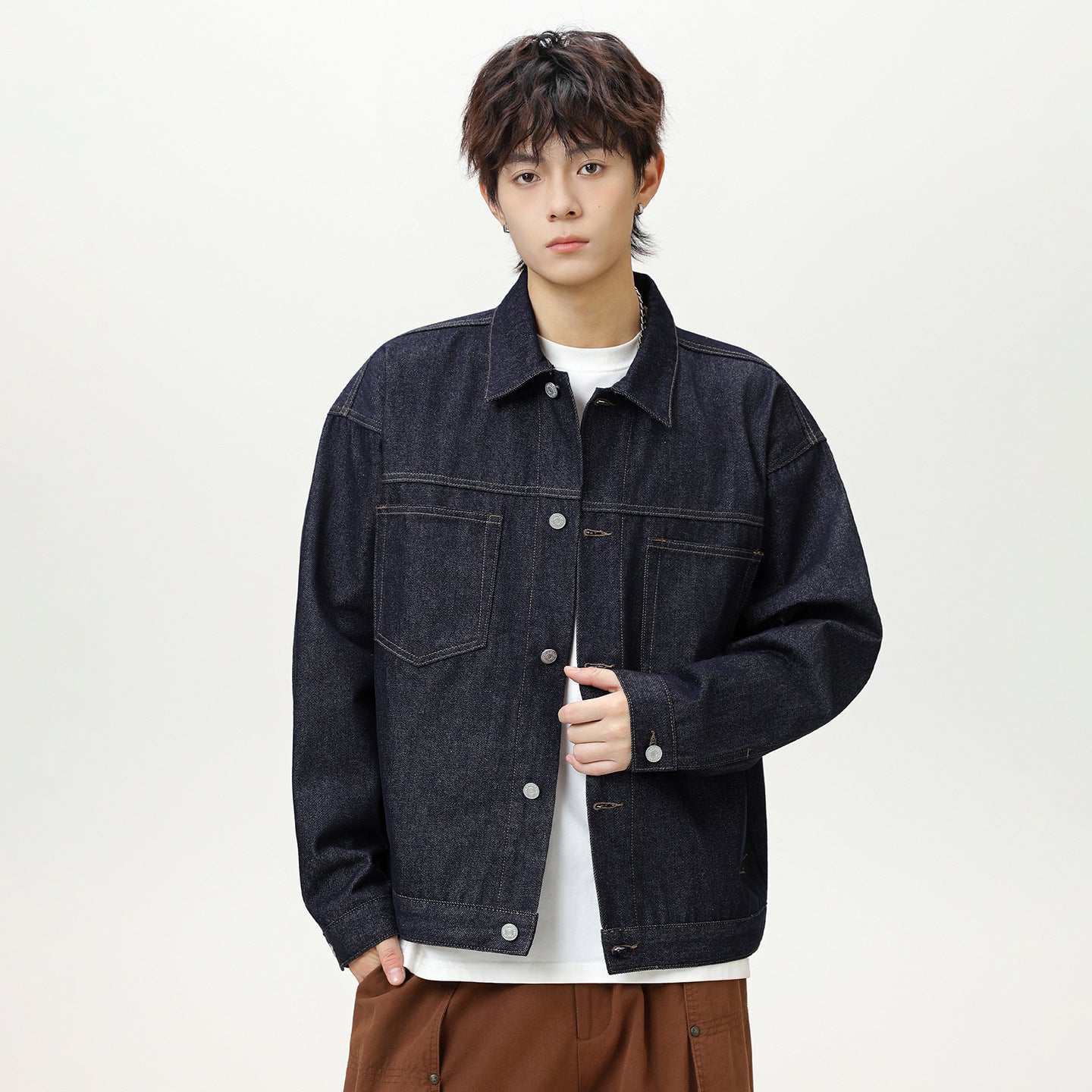 Make a bold statement with this men’s autumn denim jacket, featuring eye-catching bright stitching and a relaxed silhouette. Designed for everyday wear, it combines casual comfort with modern street-ready appeal.