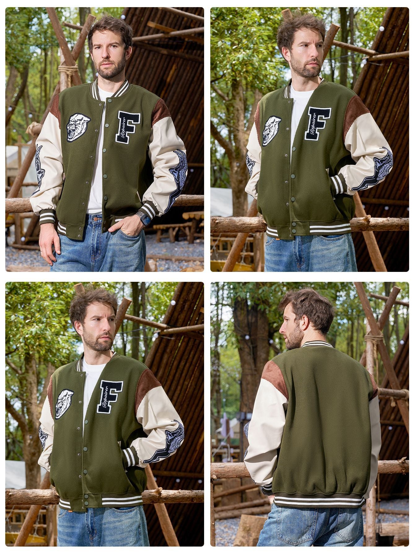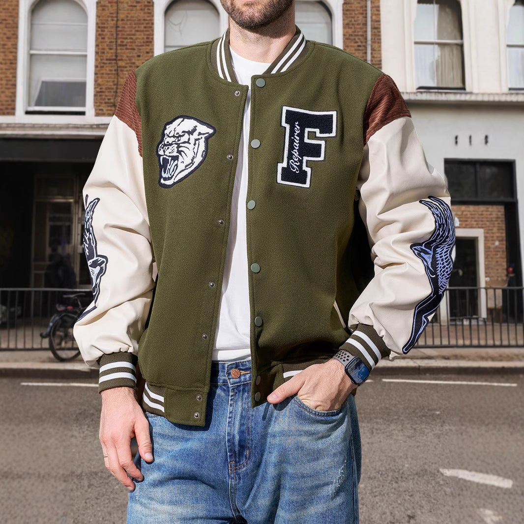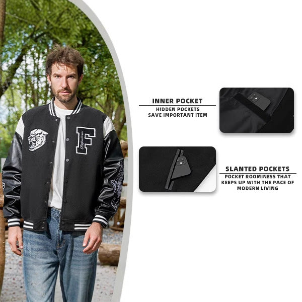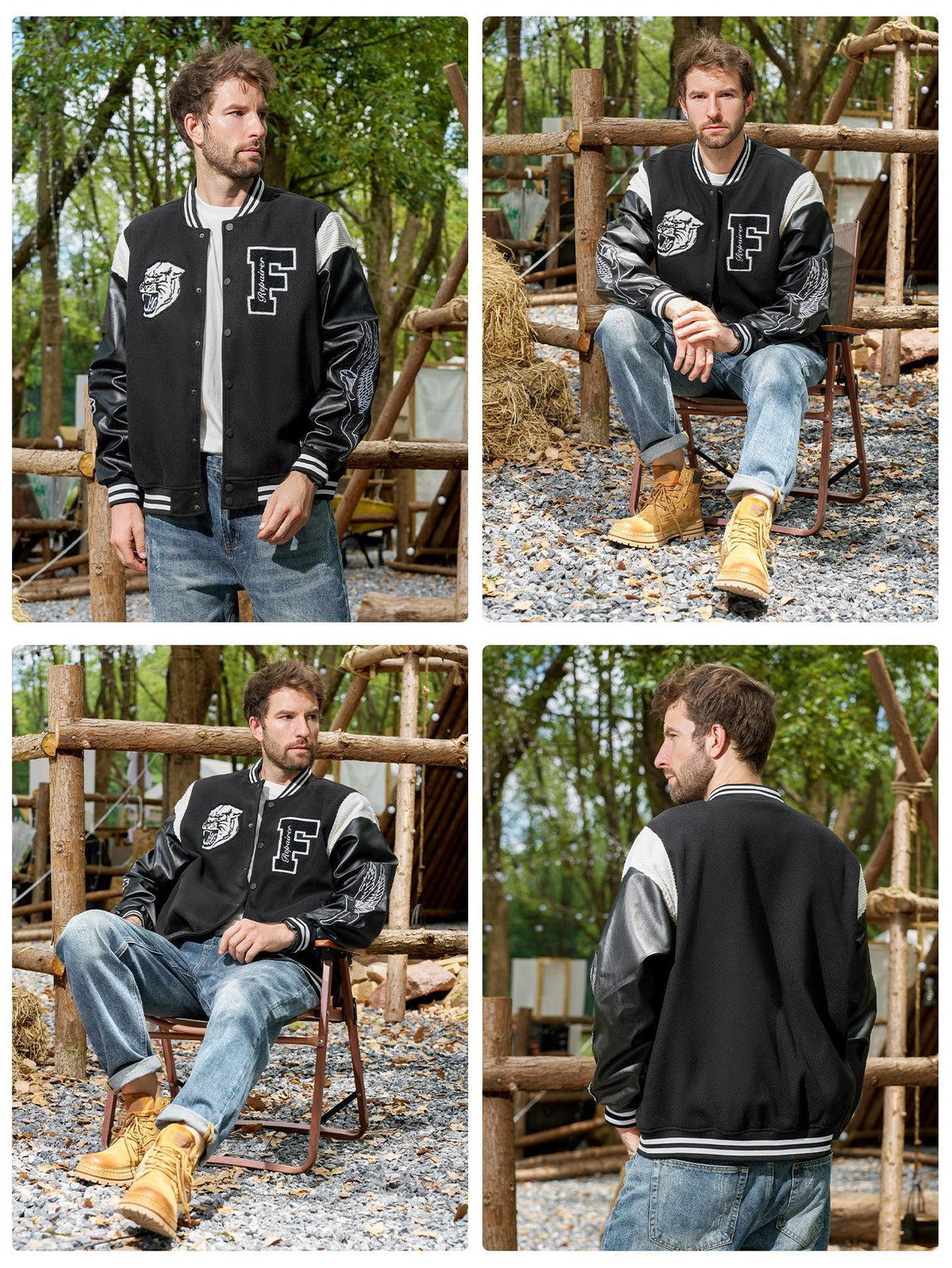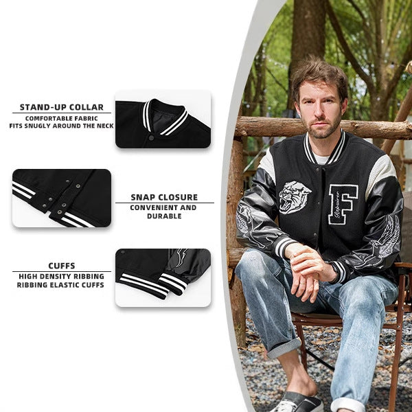 Bring back the charm of American retro fashion with this men’s leather varsity jacket. Designed with bold animal and letter embroidery, it combines rugged street style with timeless baseball team spirit.