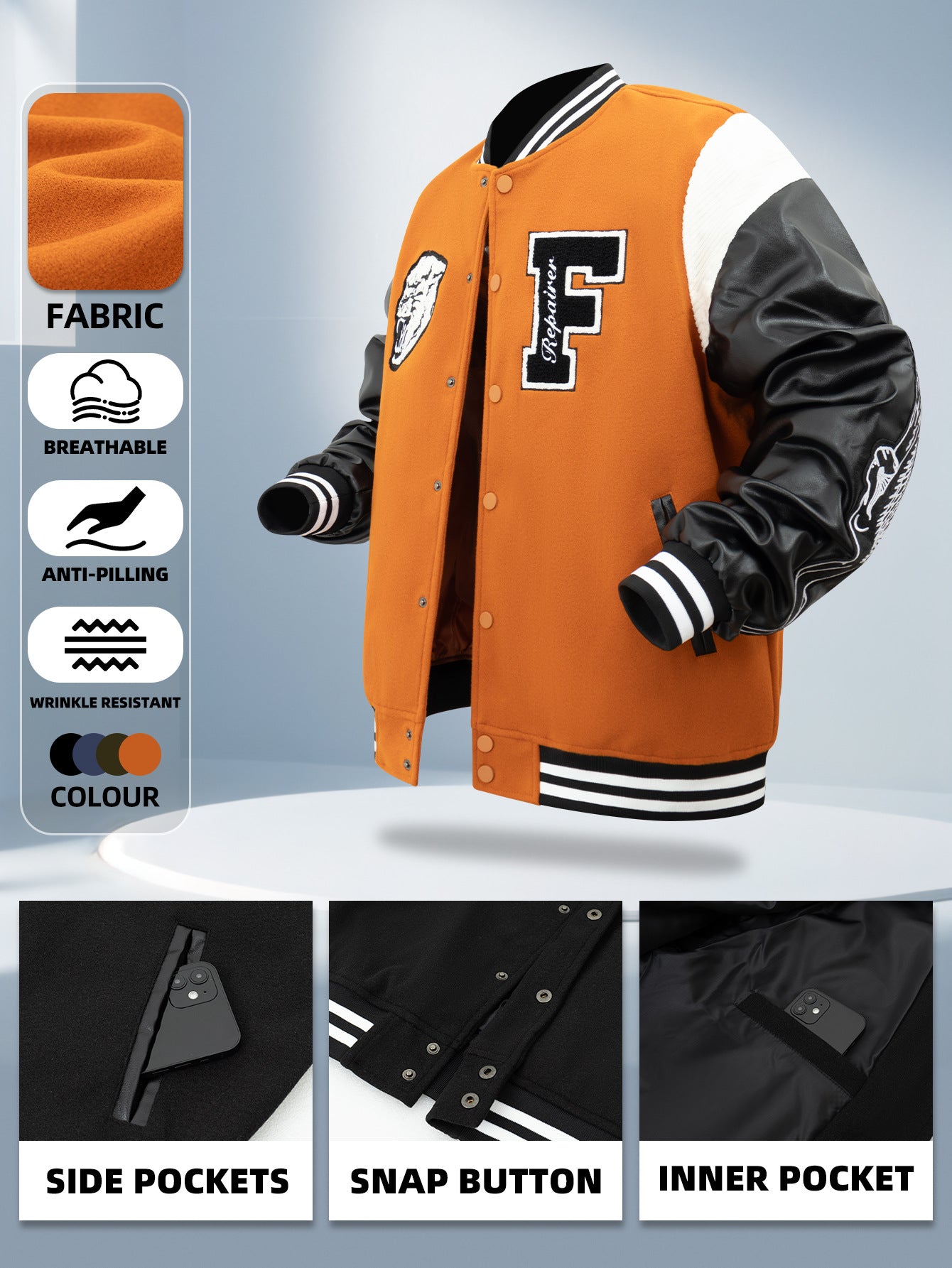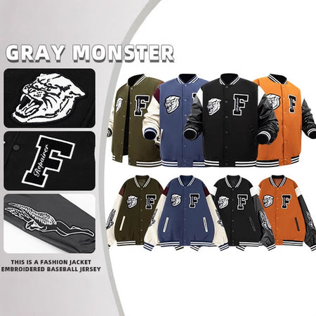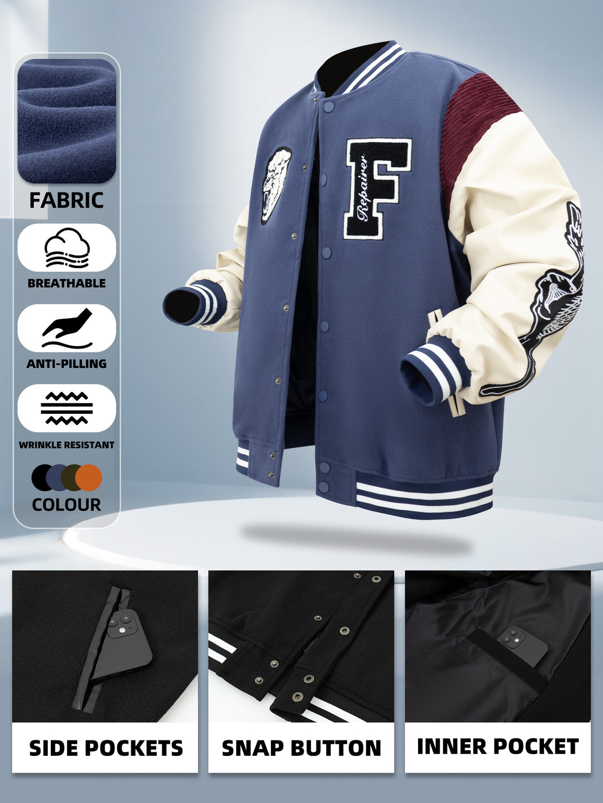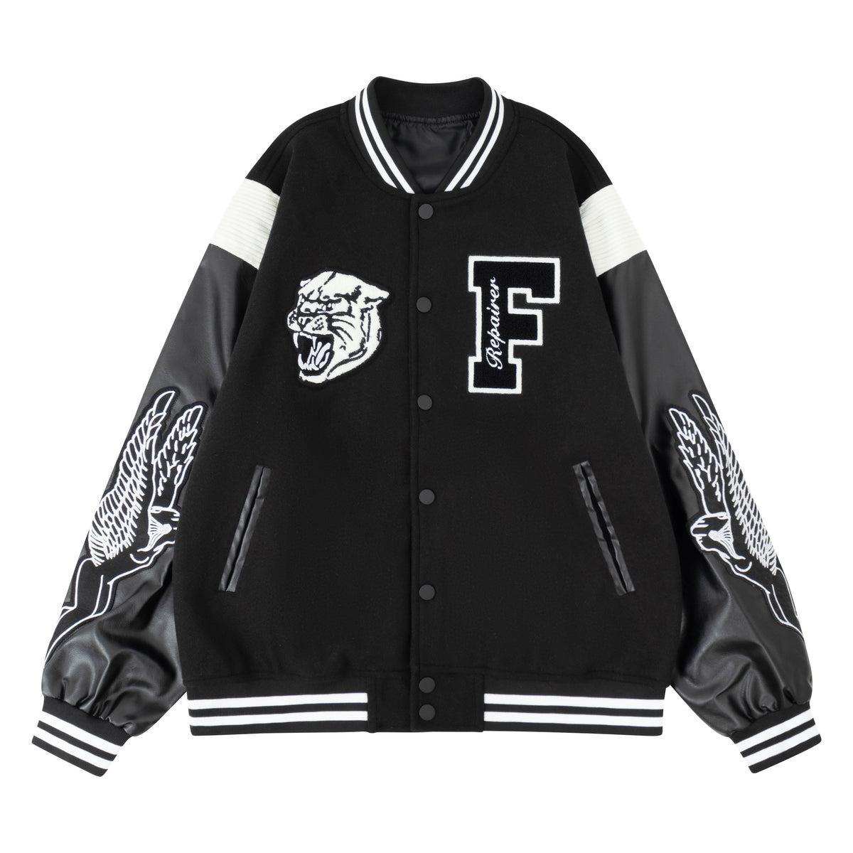Bring back the charm of American retro fashion with this men’s leather varsity jacket. Designed with bold animal and letter embroidery, it combines rugged street style with timeless baseball team spirit.