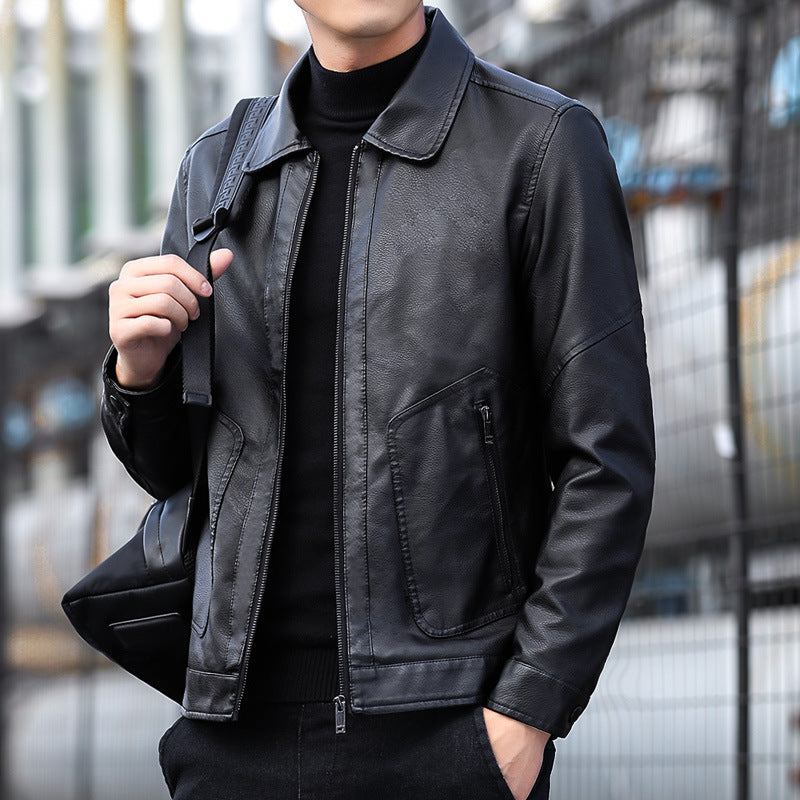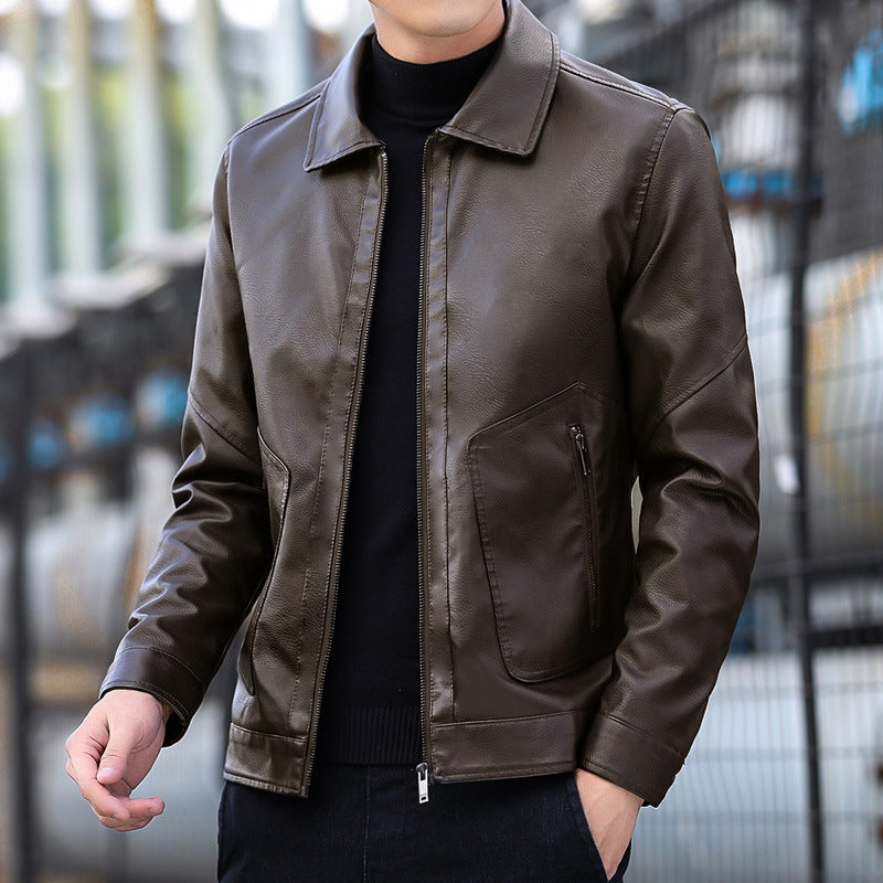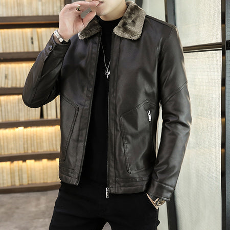 Middle-Aged Men’s Fleece-Lined Leather Motorcycle Jacket