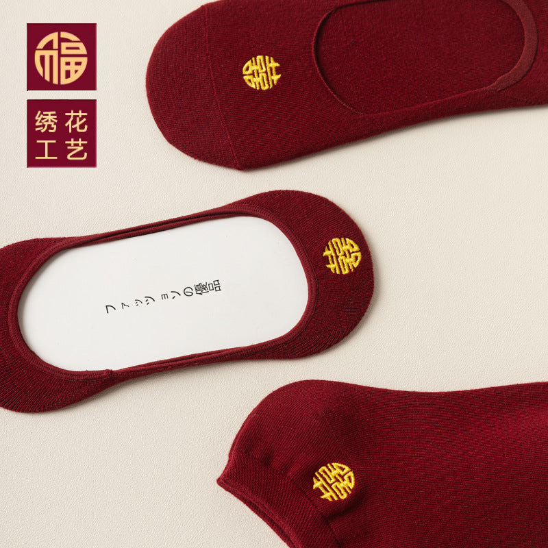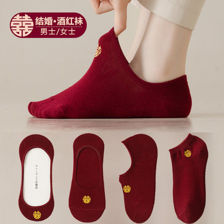 (Pack of 5)-Wedding Couple Socks – Wine Red Festive Boat Pair
